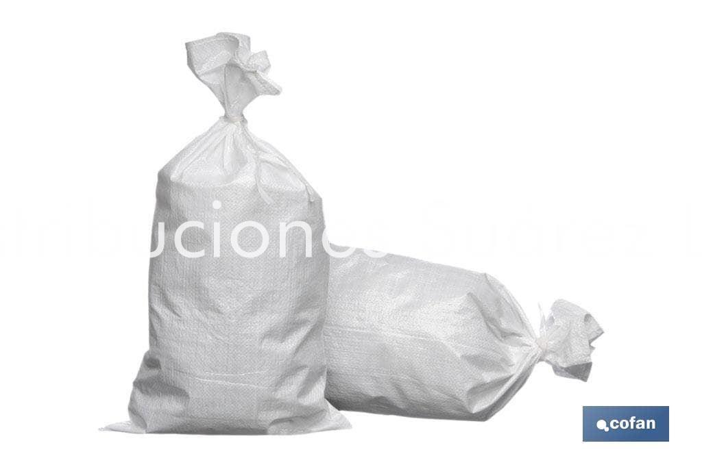 PACK COMPUESTO DE 10 SACOS DE RAFIA RETRÁCTIL DE COLOR BLANCO, CON MEDIDAS DE 60X100 CM. SACOS IDEALES PARA ESCOMBROS, BASURAS, RESIDUOS Y TRANSPORTES.
